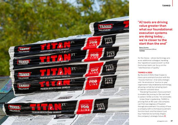 TAMKO in 2026 By the end of 2026, Dean hopes to have a procurement function with the“ muscle memory” of an elite strategic unit. He envisions a“ source-to-pay” organisation fully enabled by technology, allowing a small but amazing team to deliver outsized value.