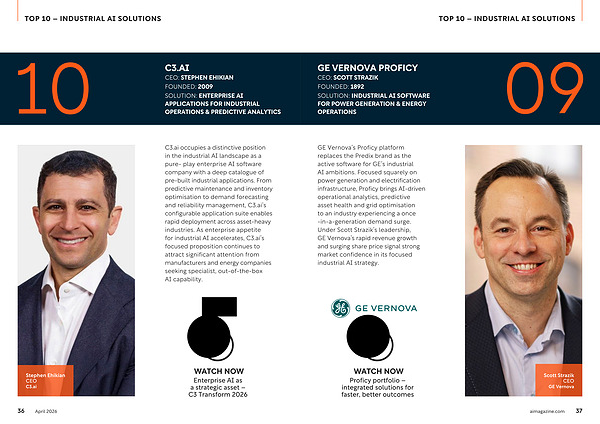 GE Vernova’ s Proficy platform replaces the Predix brand as the active software for GE’ s industrial AI ambitions. Focused squarely on power generation and electrification infrastructure, Proficy brings AI-driven operational analytics, predictive asset health and grid optimisation to an industry experiencing a once-in-a-generation demand surge. Under Scott Strazik’ s leadership, GE Vernova’ s rapid revenue growth and surging share price signal strong market confidence in its focused industrial AI strategy.