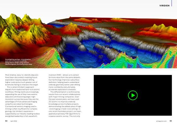 This is where Viridien’ s approach departs from traditional hard-rock seismic workflows. Mining clients are increasingly expanding the use of their new seismic data and commissioning larger, highresolution surveys because they see the advantages of more advanced imaging using the very latest technologies. Conventional seismic imaging used in mining is often insufficient for complex geology, but Viridien’ s experience – supported by our industry-leading toolbox and global leadership in full-waveform inversion( FWI) – allows us to extract far more value from the same datasets. Our technology improves subsurface definition, helping teams understand orebody geometry earlier, plan drilling more confidently and ultimately accelerate exploration schedules.