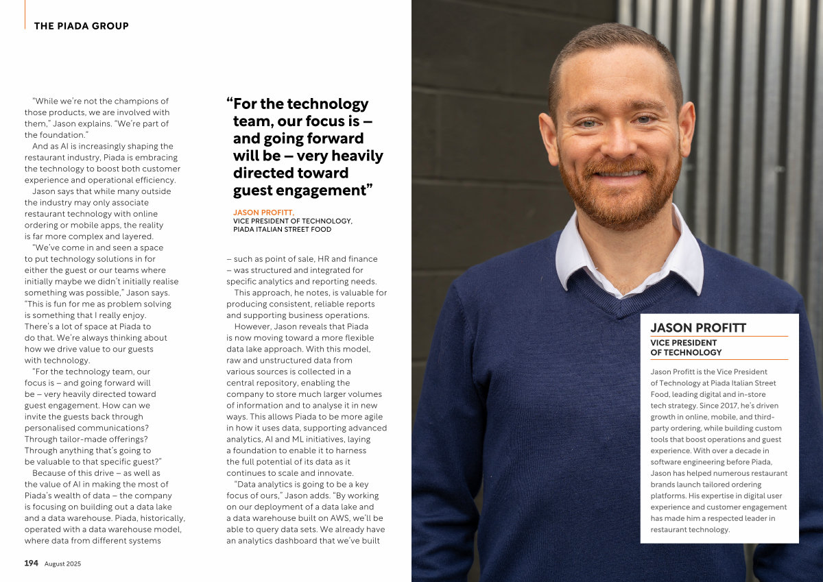 “ We’ ve come in and seen a space to put technology solutions in for either the guest or our teams where initially maybe we didn’ t initially realise something was possible,” Jason says.“ This is fun for me as problem solving is something that I really enjoy. There’ s a lot of space at Piada to do that. We’ re always thinking about how we drive value to our guests with technology.