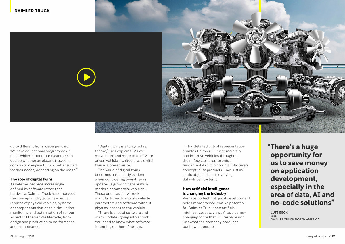 The role of digital twins As vehicles become increasingly defined by software rather than hardware, Daimler Truck has embraced the concept of digital twins – virtual replicas of physical vehicles, systems or components that enable simulation, monitoring and optimisation of various aspects of the vehicle lifecycle, from design and production to performance and maintenance.