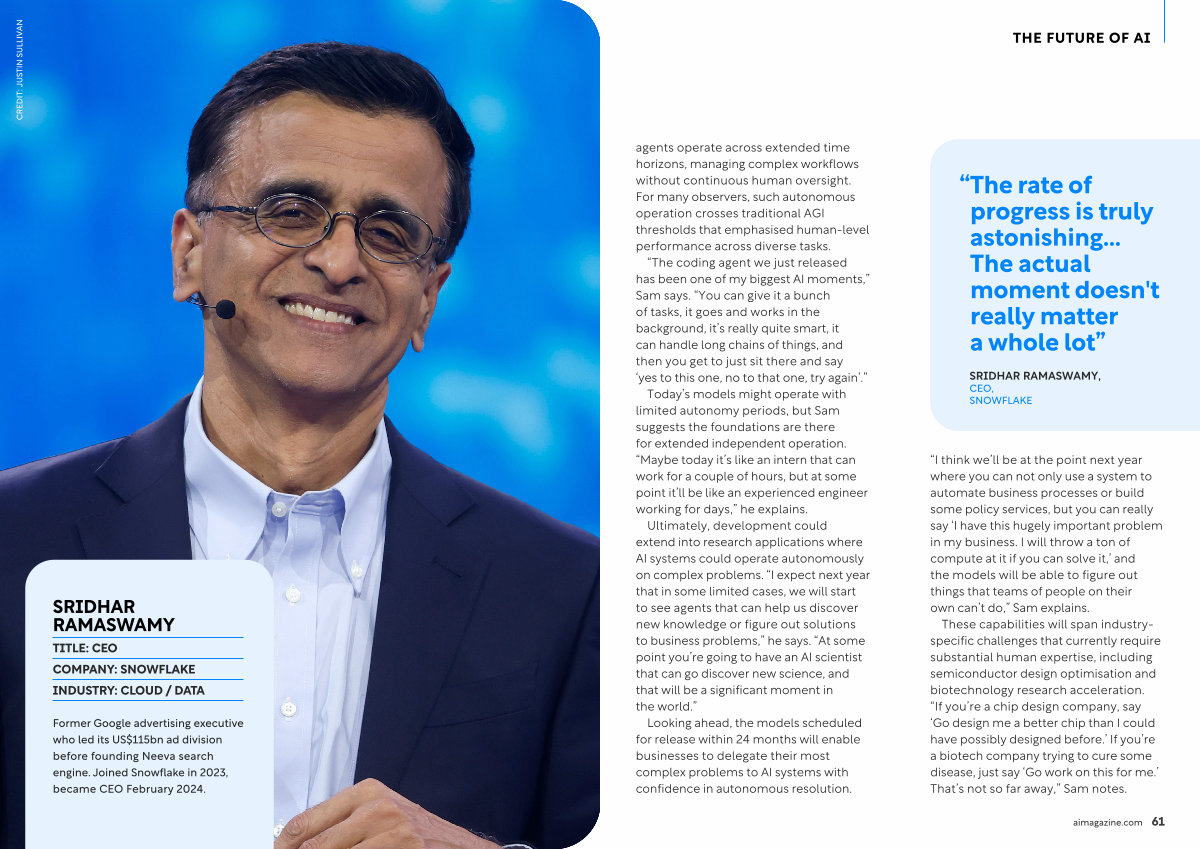 These capabilities will span industryspecific challenges that currently require substantial human expertise, including semiconductor design optimisation and biotechnology research acceleration.“ If you’ re a chip design company, say‘ Go design me a better chip than I could have possibly designed before.’ If you’ re a biotech company trying to cure some disease, just say‘ Go work on this for me.’ That’ s not so far away,” Sam notes.