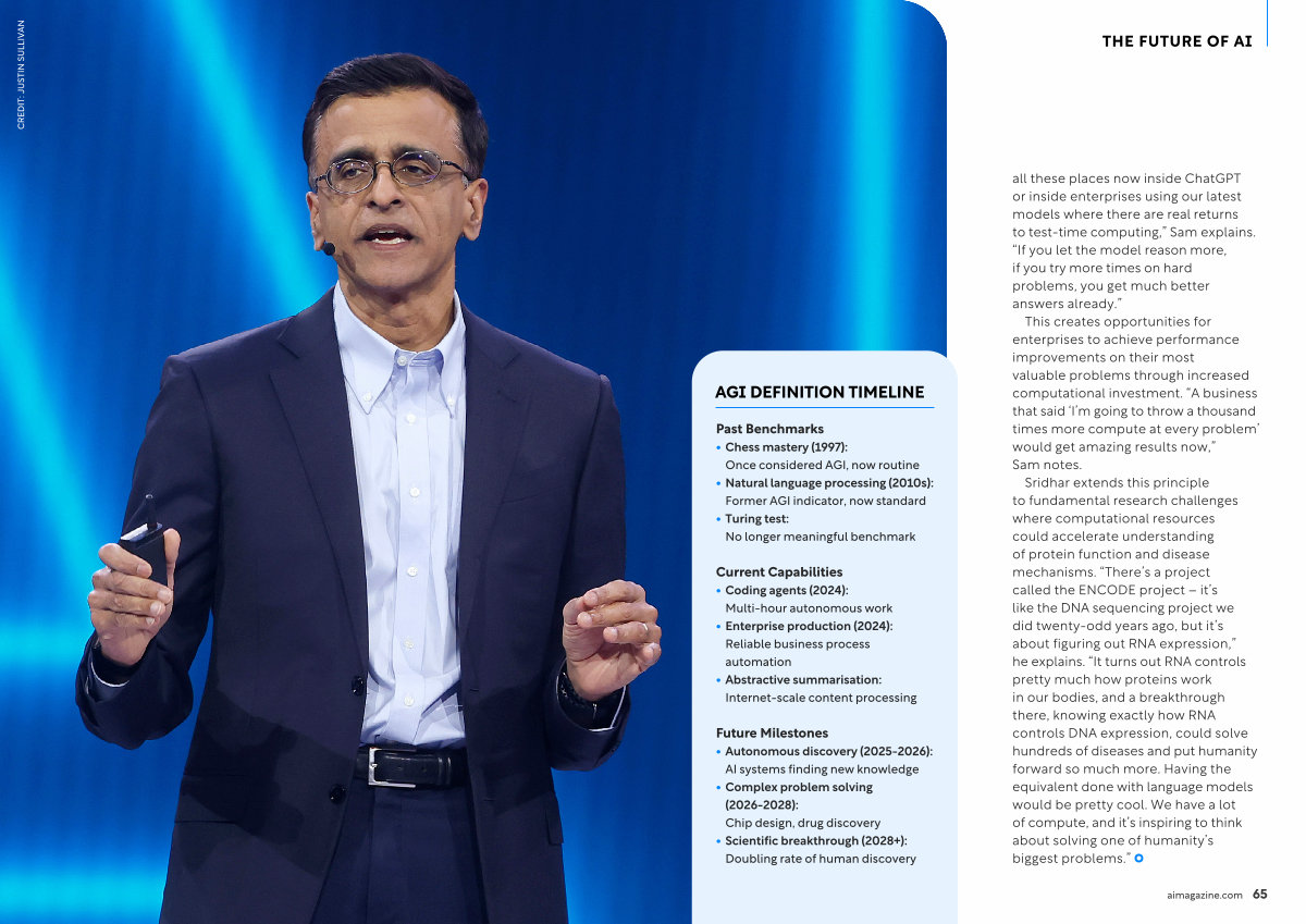 Sridhar extends this principle to fundamental research challenges where computational resources could accelerate understanding of protein function and disease mechanisms.“ There’ s a project called the ENCODE project – it’ s like the DNA sequencing project we did twenty-odd years ago, but it’ s about figuring out RNA expression,” he explains.“ It turns out RNA controls pretty much how proteins work in our bodies, and a breakthrough there, knowing exactly how RNA controls DNA expression, could solve hundreds of diseases and put humanity forward so much more. Having the equivalent done with language models would be pretty cool. We have a lot of compute, and it’ s inspiring to think about solving one of humanity’ s biggest problems.” aimagazine. com 65