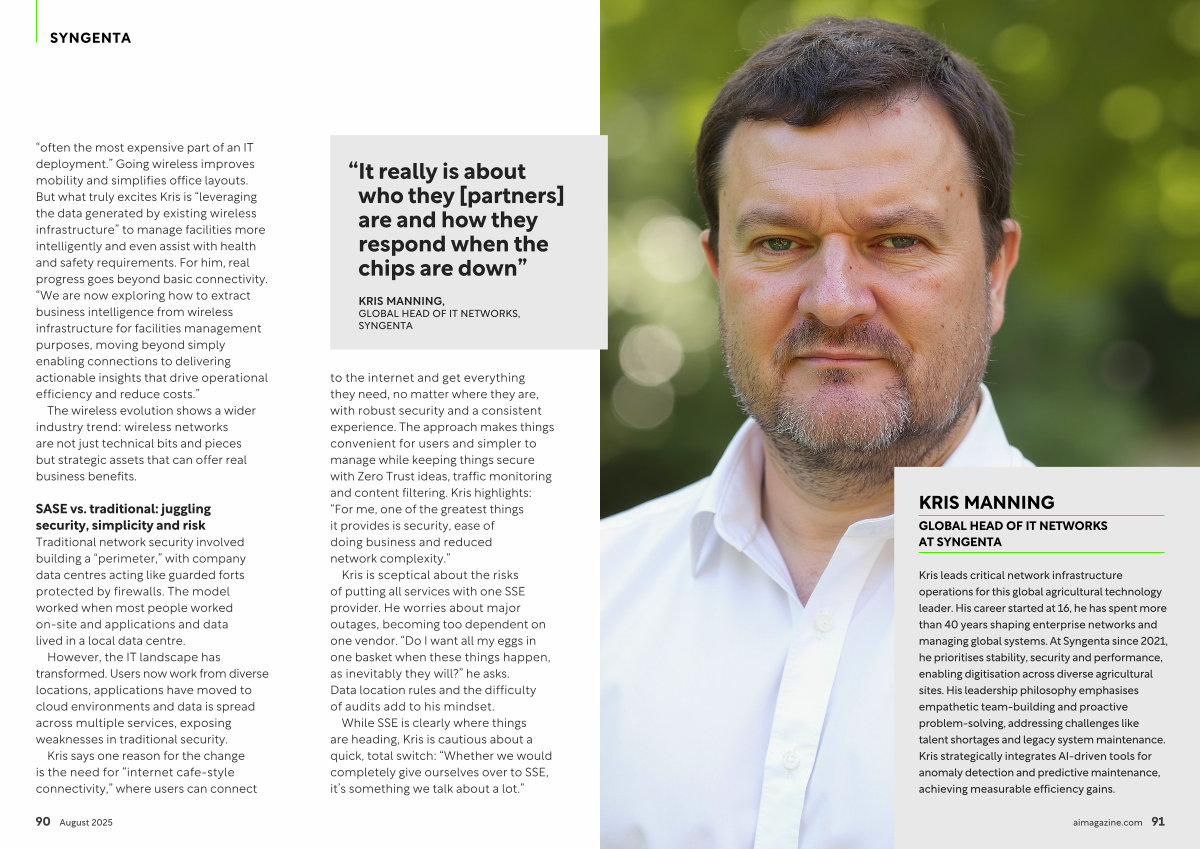Kris leads critical network infrastructure operations for this global agricultural technology leader. His career started at 16, he has spent more than 40 years shaping enterprise networks and managing global systems. At Syngenta since 2021, he prioritises stability, security and performance, enabling digitisation across diverse agricultural sites. His leadership philosophy emphasises empathetic team-building and proactive problem-solving, addressing challenges like talent shortages and legacy system maintenance. Kris strategically integrates AI-driven tools for anomaly detection and predictive maintenance, achieving measurable efficiency gains.