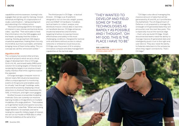 “ CX Edge is also about managing the massive amount of data that will be generated by AI and ML as it proliferates the battlefield . The US Department of Defense is not prepared to manage the onslaught of AI generated data they will encounter over the next few years . This is especially true at the tactical edge – that ’ s why we build CX Edge . Small , disconnected teams need the ability to manage massive AI generated data and intelligently push it out to the right end user device . They also need the ability to federate data back to the enterprise when they regain connectivity . That ’ s CX Edge !” aimagazine . com 155