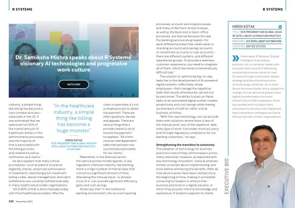 Hiren leads R Systems ’ Global Intelligent Automation practice . He is a versatile leader with a proven track record of delivering substantial business value for over 25 years through information-based strategy and structured execution of technology initiatives . As a resultdriven business leader and a catalyst for change , he has delivered global-scale digital transformation for some of the Fortune 500 companies . Hiren has worked with multiple client executives to develop and implement their automation strategies and drive efficient growth in their organisations .