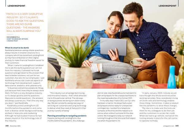 “ When I came to LendingPoint it enabled me to ask the dumb questions as I am not from this industry . It allowed me to ask questions and get down to the answers that lead to better solutions , not just for our customers , but also for our employees ,” said Kasibhatla whose role covers all aspects of technology from development , support , data science , analytics , and cybersecurity .