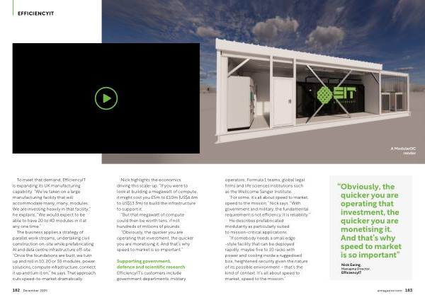 To meet that demand, EfficiencyIT is expanding its UK manufacturing capability.“ We’ ve taken on a large manufacturing facility that will accommodate many, many, modules. We are investing heavily in that facility,” he explains.“ We would expect to be able to have 20 to 40 modules in it at any one time.”