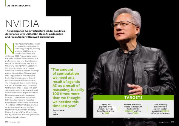 Nvidia has cemented its position as the world’ s most valuable technology company, reaching a historic US $ 4.5tn market capitalisation at the end of October 2025. The company says its Blackwell architecture represents a 40x performance leap over its predecessor Hopper, while controlling over 80 % of the AI GPU training market. September 2025 brought the industry’ s largest infrastructure announcement: a strategic partnership with OpenAI to deploy at least 10 gigawatts of Nvidia systems, backed by Nvidia’ s unprecedented US $ 100bn investment commitment. The first gigawatt deployment utilising the Vera Rubin platform is scheduled for the second half of 2026, with each subsequent phase unlocking additional investment tranches. Beyond hardware, Nvidia’ s comprehensive ecosystem includes CUDA software dominance, DGX Cloud services and integrated networking solutions through Spectrum-X and BlueField technologies, creating an end-to-end AI factory platform that major cloud providers including Microsoft Azure, AWS and Oracle have rapidly adopted for their next-generation infrastructure buildouts.