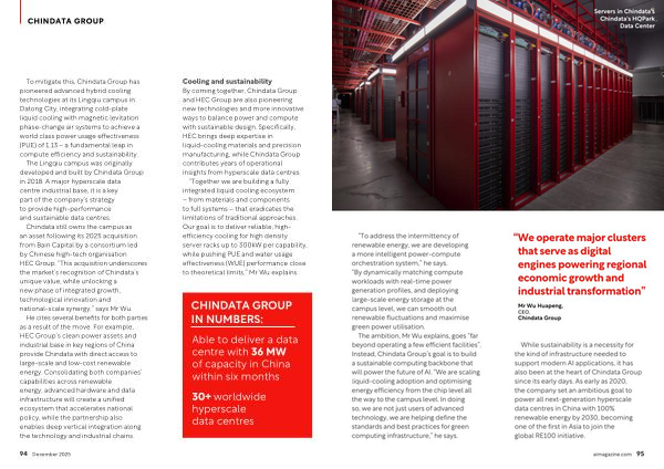 While sustainability is a necessity for the kind of infrastructure needed to support modern AI applications, it has also been at the heart of Chindata Group since its early days. As early as 2020, the company set an ambitious goal to power all next-generation hyperscale data centres in China with 100 % renewable energy by 2030, becoming one of the first in Asia to join the global RE100 initiative. aimagazine. com 95