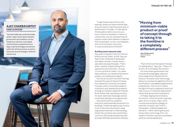 Building teams beyond code Ajay spent a decade in the Civil Service before joining Thales. At Dstl, Ajay ran teams that combined AI developers with data scientists, human factors specialists and psychologists.“ That’ s when I started implementing AI for operational environments,” he says.“ It’ s not just the AI coders. You need data scientists, you need human factors people, you need psychologists.”