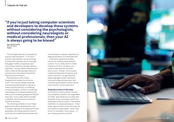 Keeping humans in the loop For mission-critical systems, human accountability remains non-negotiable at Thales. Ajay observes a societal split between those resisting AI and those adopting it without caution. The anxiety manifests in unexpected places.“ Even when I get into taxis in the morning, the first question I get asked – when they know I’ m working in the AI space – is, am I losing my job to a robot?”