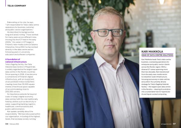 Kari Maikkola leads Telia’ s data centre business, overseeing operations for enterprise and public-sector clients across the Nordic region. With a diverse ICT career spanning more than two decades, Kari transitioned from the early new-media sector to industrial-scale infrastructure, focusing exclusively on data centres since 2013. He currently directs strategy for Telia’ s flagship Helsinki facility – the largest open data centre in the Nordics – steering its evolution into a sustainable hub for hyperscale AI and liquid-cooled computing.