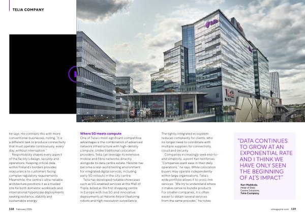 Where 5G meets compute One of Telia’ s most significant competitive advantages is the combination of advanced network infrastructure with high-density compute. Unlike traditional colocation providers, Telia can leverage its extensive mobile and fibre networks directly alongside its data centre estate. Helsinki has become a real-world testing environment for integrated digital services, including early 5G rollouts in the city centre.