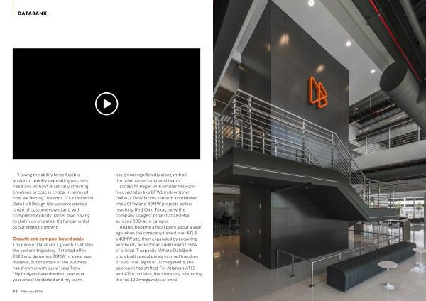 Growth and campus-based scale The pace of DataBank’ s growth illustrates the sector’ s trajectory.“ I started off in 2020 and delivering 20MW in a year was massive, but the scale of the business has grown enormously,” says Tony.“ My budgets have doubled year over year since I’ ve started and my team has grown significantly along with all the other cross-functional teams.”