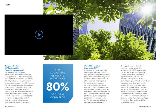 Can you introduce SAP Sustainability Footprint Management? SAP Sustainability Footprint Management is a major component of our portfolio. As the name suggests, it is used to calculate carbon footprints at both product and corporate level, at scale, utilising data from ERP systems. The ERP-centric approach is important to our strategy. Many customers use SFM to calculate Product Carbon Footprints( PCFs), driving optimisation across their industries. Recently, we have also expanded SAP Sustainability Footprint Management to include other environmental categories, such as abiotic resource depletion.