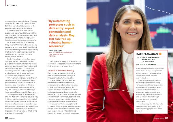 Prior to joining Roy Hill , Kate held several positions managing largescale technology operations teams for BHP . aimagazine . com 113