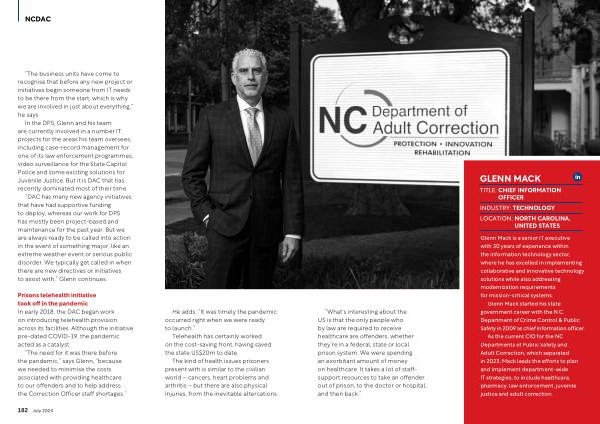 As the current CIO for the NC Departments of Public Safety and Adult Correction , which separated in 2023 ; Mack leads the efforts to plan and implement department-wide IT strategies , to include healthcare , pharmacy , law enforcement , juvenile justice and adult correction .
