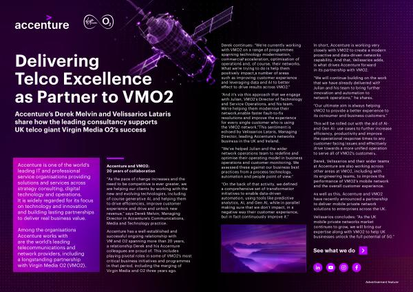“ And it ’ s via this approach that we engage with Julian , VMO2 ’ s Director of Technology and Service Operations , and his team . We ’ re helping them modernise their network , enable faster fault-to-fix resolutions and improve the experience for every single customer who is using the VMO2 network .” This sentiment is echoed by Velissarios Lataris , Managing Director , leading Accenture ’ s networks business in the UK and Ireland .