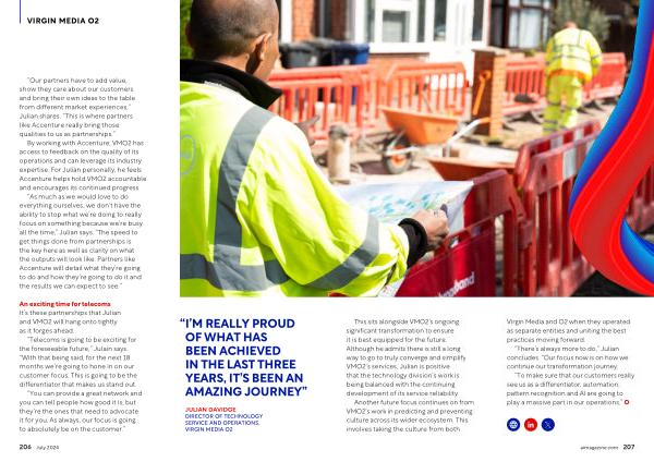 By working with Accenture , VMO2 has access to feedback on the quality of its operations and can leverage its industry expertise . For Julian personally , he feels Accenture helps hold VMO2 accountable and encourages its continued progress . “ As much as we would love to do everything ourselves , we don ’ t have the ability to stop what we ’ re doing to really focus on something because we ’ re busy all the time ,” Julian says . “ The speed to get things done from partnerships is the key here as well as clarity on what the outputs will look like . Partners like Accenture will detail what they ’ re going to do and how they ’ re going to do it and the results we can expect to see .”