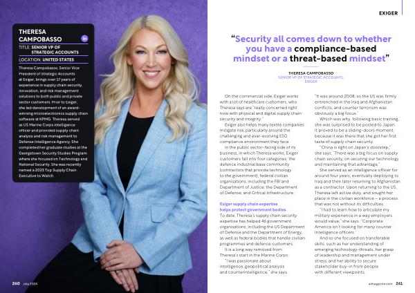 Theresa Campobasso , Senior Vice President of Strategic Accounts at Exiger , brings over 17 years of experience in supply chain security , innovation , and risk management solutions to both public and private sector customers . Prior to Exiger , she led development of an awardwinning microelectronics supply chain software at KPMG . Theresa served as US Marine Corps intelligence officer and provided supply chain analysis and risk management to Defense Intelligence Agency . She completed her graduate studies at the Georgetown Security Studies Program where she focused on Technology and National Security . She was recently named a 2023 Top Supply Chain Executive to Watch .