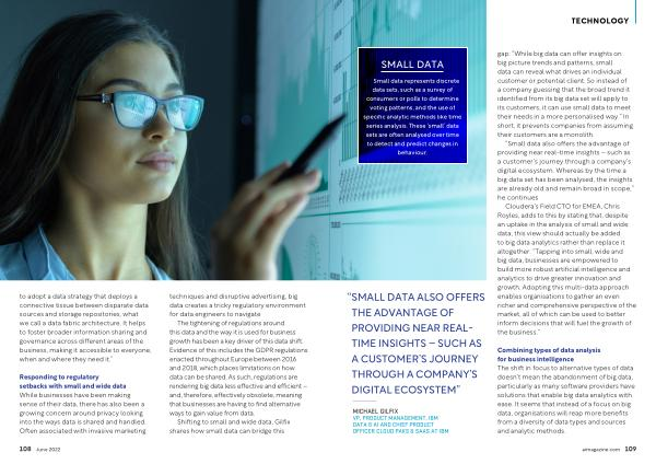 MICHAEL GILFIX VP , PRODUCT MANAGEMENT , IBM DATA & AI AND CHIEF PRODUCT OFFICER CLOUD PAKS & SAAS AT IBM gap : “ While big data can offer insights on big picture trends and patterns , small data can reveal what drives an individual customer or potential client . So instead of a company guessing that the broad trend it identified from its big data set will apply to its customers , it can use small data to meet their needs in a more personalised way .” In short , it prevents companies from assuming their customers are a monolith .