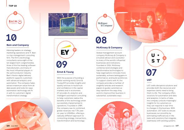 Advising leaders on strategy , marketing operations and IT , Bain is a top management consulting firm . The firm ' s technology consultants serve eight of the ten largest tech conglomerates , three of the five leading software manufacturers , and many of the most influential players in the semiconductor industry . Bain ’ s Vector digital delivery platform supports customers with advanced analytics and automation . The company helps extract maximum value from all data assets and looks for ways automation technology will fit in with its customers ' digital transformation strategy .