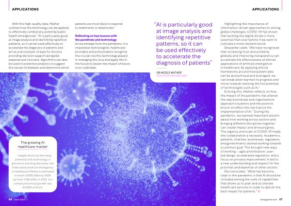 With this high-quality data , Mather outlines how the technology can be applied to effectively combat any potential public health emergencies : “ AI is particularly good at image analysis and identifying repetitive patterns , so it can be used effectively to accelerate the diagnosis of patients and act as a second pair of eyes for doctors , providing decision support alongside experienced clinicians . Algorithms can also be used in predictive analytics to suggest the causes of diseases and determine which patients are most likely to respond to treatments or deteriorate .”
