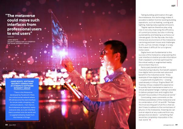 Particularly beneficial for the manufacturing industry , Konnanath explains how digital twins provide real value and benefit to the industrial world : “ A key example of how digital twin technology – coupled with AI platforms – is being used already in Infosys ’ Engine Wash VR Training . Infosys created this experience to quickly train maintenance teams in a virtual aeroplane hangar , making it possible to deliver perspectives and insights that wouldn ’ t be possible in the physical world .” Concluding , Lewis comments on the limitless possibilities of the metaverse and its combination of IoT , AI and XR : “ Perhaps the most exciting part of all this is that we don ’ t have to adhere to the normal laws of physics in the metaverse , meaning we can look at objects at any scale and from any perspective we desire – something that would be completely impossible in the real-world .” aimagazine . com 89