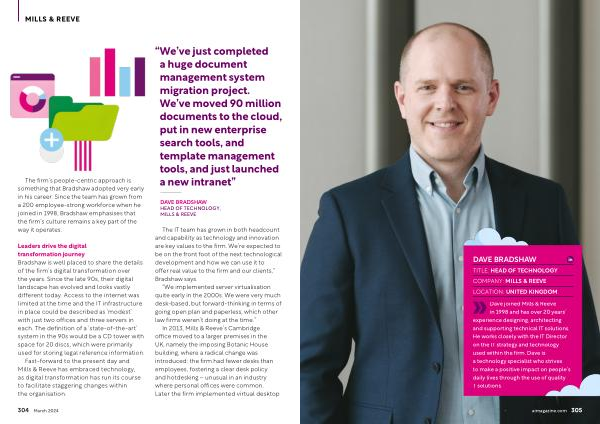 Dave joined Mills & Reeve in 1998 and has over 20 years ’ experience designing , architecting and supporting technical IT solutions . He works closely with the IT Director on the IT strategy and technology used within the firm . Dave is a technology specialist who strives to make a positive impact on people ’ s daily lives through the use of quality T solutions . aimagazine . com 305
