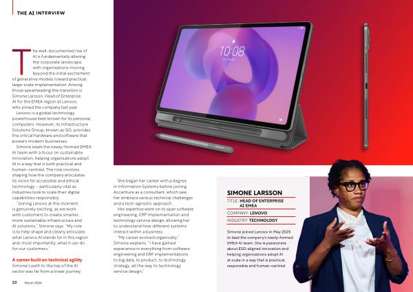 Simone joined Lenovo in May 2025 to lead the company’ s newly-formed EMEA AI team. She is passionate about ESG-aligned innovation and helping organisations adopt AI at scale in a way that is practical, responsible and human-centred.