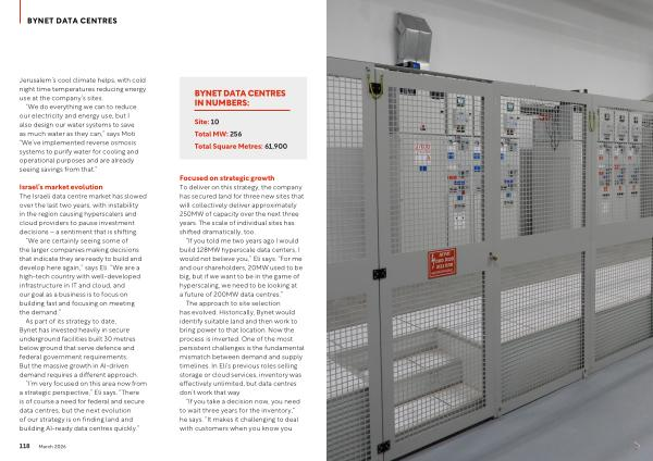 Israel’ s market evolution The Israeli data centre market has slowed over the last two years, with instability in the region causing hyperscalers and cloud providers to pause investment decisions – a sentiment that is shifting.“ We are certainly seeing some of the larger companies making decisions that indicate they are ready to build and develop here again,” says Eli.“ We are a high-tech country with well-developed infrastructure in IT and cloud, and our goal as a business is to focus on building fast and focusing on meeting the demand.”