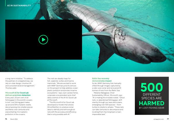 Melanie Nakagawa, Chief Sustainability Officer, Microsoft, says:“ AI is making the invisible visible.“ Ghost nets, or abandoned fishing gear, drift silently through our seas and oceans, entangling over 500 species – from turtles to sharks to whales.“ These nets can take centuries to decompose and locating them has long been a nearimpossible task.”
