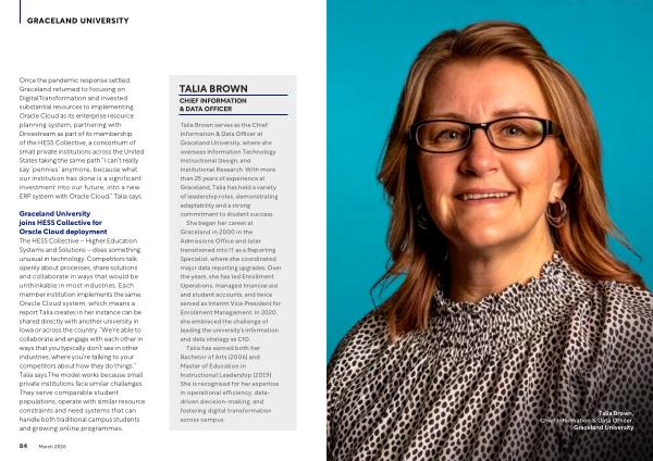 Graceland University joins HESS Collective for Oracle Cloud deployment The HESS Collective – Higher Education Systems and Solutions – does something unusual in technology. Competitors talk openly about processes, share solutions and collaborate in ways that would be unthinkable in most industries. Each member institution implements the same Oracle Cloud system, which means a report Talia creates in her instance can be shared directly with another university in Iowa or across the country.“ We’ re able to collaborate and engage with each other in ways that you typically don’ t see in other industries, where you’ re talking to your competitors about how they do things,” Talia says. The model works because small private institutions face similar challenges. They serve comparable student populations, operate with similar resource constraints and need systems that can handle both traditional campus students and growing online programmes.