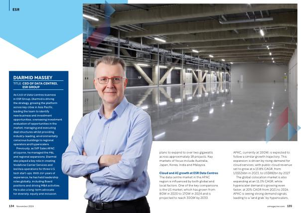 As CEO of Data Centres business in ESR Group , Diarmid is driving the strategy , growing the platform across key cities in Asia Pacific , leading the team to identify new business and investment opportunities ; overseeing investment evaluation of opportunities in the market ; managing and executing deal structures whilst providing industry-leading , environmentally conscious buildings to regional operators and hyperscalers .