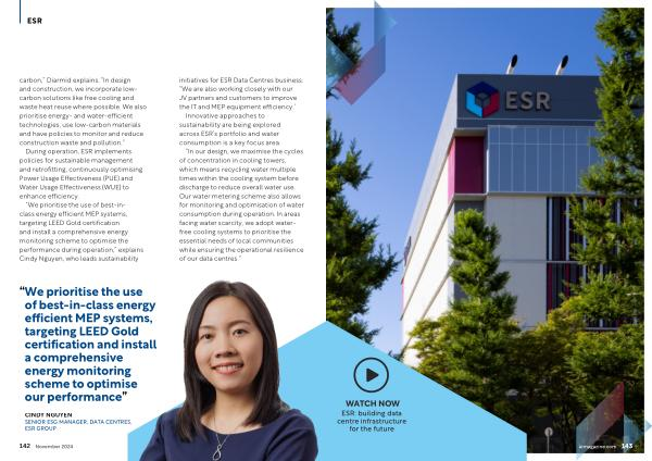 “ We prioritise the use of best-inclass energy efficient MEP systems , targeting LEED Gold certification and install a comprehensive energy monitoring scheme to optimise the performance during operation ,” explains Cindy Nguyen , who leads sustainability initiatives for ESR Data Centres business . “ We are also working closely with our JV partners and customers to improve the IT and MEP equipment efficiency .”