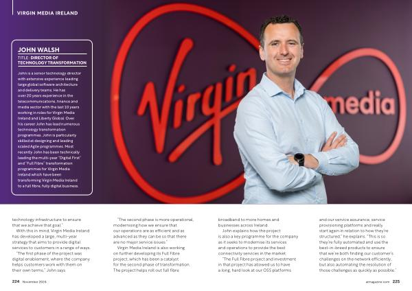 John is a senior technology director with extensive experience leading large global software architecture and delivery teams . He has over 20 years experience in the telecommunications , finance and media sector with the last 10 years working in roles for Virgin Media Ireland and Liberty Global . Over his career John has lead numerous technology transformation programmes . John is particularly skilled at designing and leading scaled Agile programmes . Most recently John has been technically leading the multi-year “ Digital First ” and “ Full Fibre ” transformation programmes for Virgin Media Ireland which have been transforming Virgin Media Ireland to a full fibre , fully digital business .