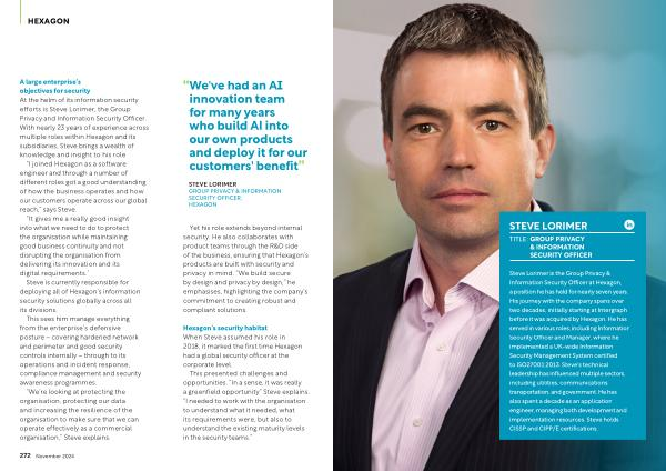 A large enterprise ’ s objectives for security At the helm of its information security efforts is Steve Lorimer , the Group Privacy and Information Security Officer . With nearly 23 years of experience across multiple roles within Hexagon and its subsidiaries , Steve brings a wealth of knowledge and insight to his role .