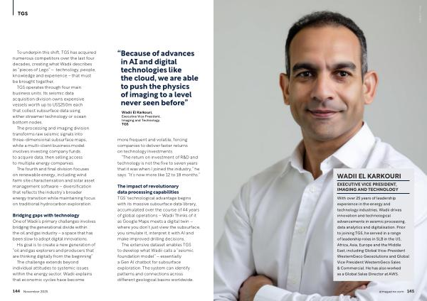 With over 25 years of leadership experience in the energy and technology industries, Wadii drives innovation and technological advancements in seismic processing, data analytics and digitalisation. Prior to joining TGS, he served in a range of leadership roles in SLB in the US, Africa, Asia, Europe and the Middle East, including Global Vice-President WesternGeco Geosolutions and Global Vice President WesternGeco Sales & Commercial. He has also worked as a Global Sales Director at AWS.