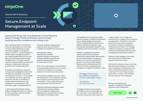 NinjaOne’ s capabilities for platform scaling and infrastructure growth Solutions30’ s implementation demonstrates how automated endpoint management platforms can scale with organisational growth. The company initially deployed NinjaOne across a limited portion of its infrastructure before expanding to full coverage as it recognised the platform’ s value.