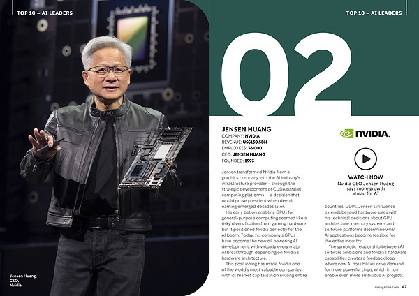 countries’ GDPs. Jensen’ s influence extends beyond hardware sales with his technical decisions about GPU architecture, memory systems and software platforms determine what AI applications become feasible for the entire industry.