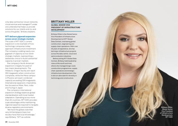 Brittany Miller is the Global Senior Vice President of Infrastructure Development at NTT Global Data Centers, overseeing global construction, engineering and supply chain operations. With over 15 years of experience, she has led major infrastructure projects across the data centre, cloud and semiconductor industries.
