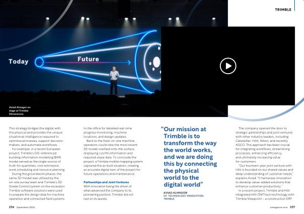 During the groundwork phases , the same 3D model was utilised by the on-site survey team and Trimble ’ s 3D Grade Control system on the excavator . Trimble software solutions were used to prepare the design data for machine operation and connected field systems to the office for detailed real-time progress monitoring , machine locations , and design updates .