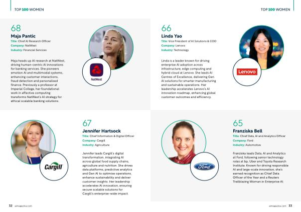 Franziska leads Data, AI and Analytics at Ford, following senior technology roles at bp, Uber and Toyota Research Institute. Known for driving responsible AI and large-scale innovation, she’ s earned recognition as Chief Data Officer of the Year and a Reuters Trailblazing Woman in Enterprise AI.