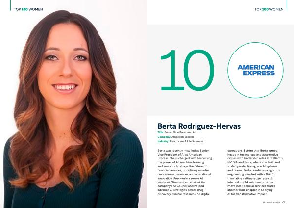 Berta was recently installed as Senior Vice President of AI at American Express. She is charged with harnessing the power of AI, machine learning and analytics to shape the future of financial services, prioritising smarter customer experiences and operational innovation. Previously a senior AI leader at Pfizer, she co‐chaired the company’ s AI Council and helped advance AI strategies across drug discovery, clinical research and digital operations. Before this, Berta turned heads in technology and automotive circles with leadership roles at Stellantis, NVIDIA and Tesla, where she built and scaled production‐grade AI systems and teams. Berta combines a rigorous engineering mindset with a flair for translating cutting‐edge research into real‐world solutions, and her move into financial services marks another bold chapter in applying AI for transformative impact.