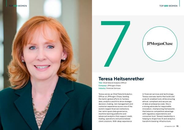 Teresa serves as Chief Data & Analytics Officer at JPMorgan Chase, leading the bank’ s global efforts to harness data, analytics and AI to drive strategic decision‐making, risk management and customer experience across one of the world’ s largest financial institutions. Her remit spans data governance, machine learning platforms and advanced analytics that support credit, trading, operations and personalised client solutions. With deep experience in financial services and technology, Teresa oversees teams that build and scale AI‐enabled tools while ensuring ethical, compliant and secure use of data at enterprise scale. She is a strong advocate for responsible innovation, championing frameworks that balance competitive advantage with regulatory expectations and consumer trust. Teresa’ s leadership is helping to shape how AI and analytics transform banking infrastructure.